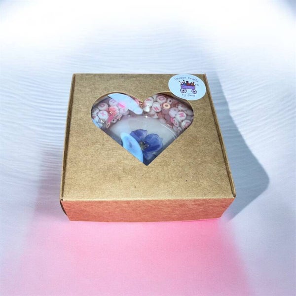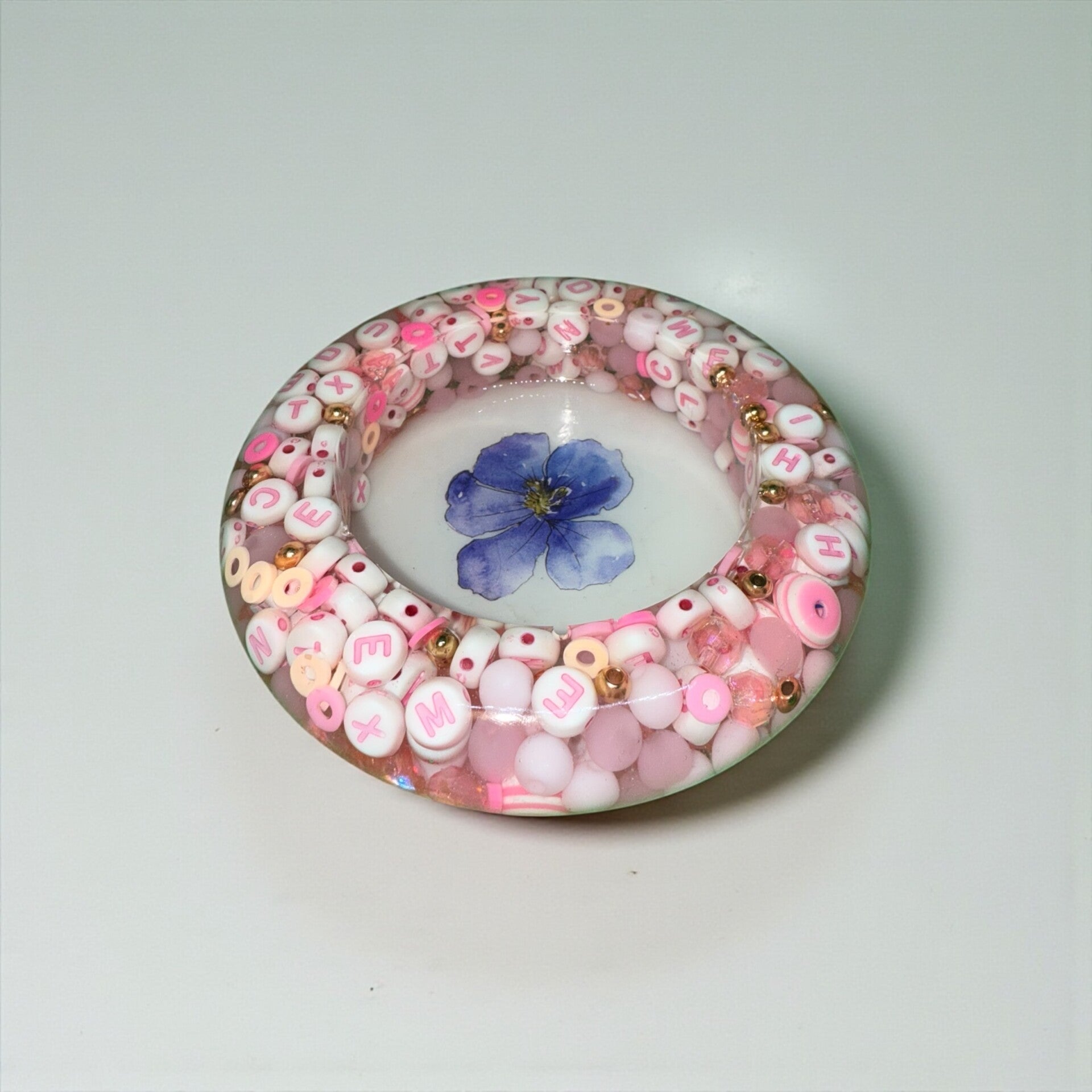 This piece blends minimalist styling with a sweet, handcrafted feel. The clear resin gives a glass-like clarity without the fragility, while the pink-and-white letters and blue flower add charm and personality. It’s a small but striking accessory that brightens daily spaces and makes a memorable gift.