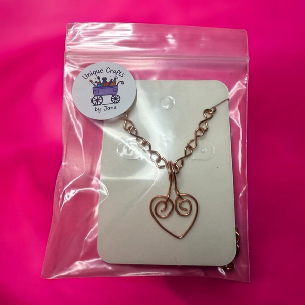 This warm copper necklace blends simple style with thoughtful symbolism. The chain is formed from repeating horizontal figure‑eight links (the lying‑down eight), a positive symbol of infinity and lasting connection. Hanging from that chain is a small, handlike wire heart pendant — 27 mm long (with the hook) and 17 mm wide — offering a gentle, understated focal point.